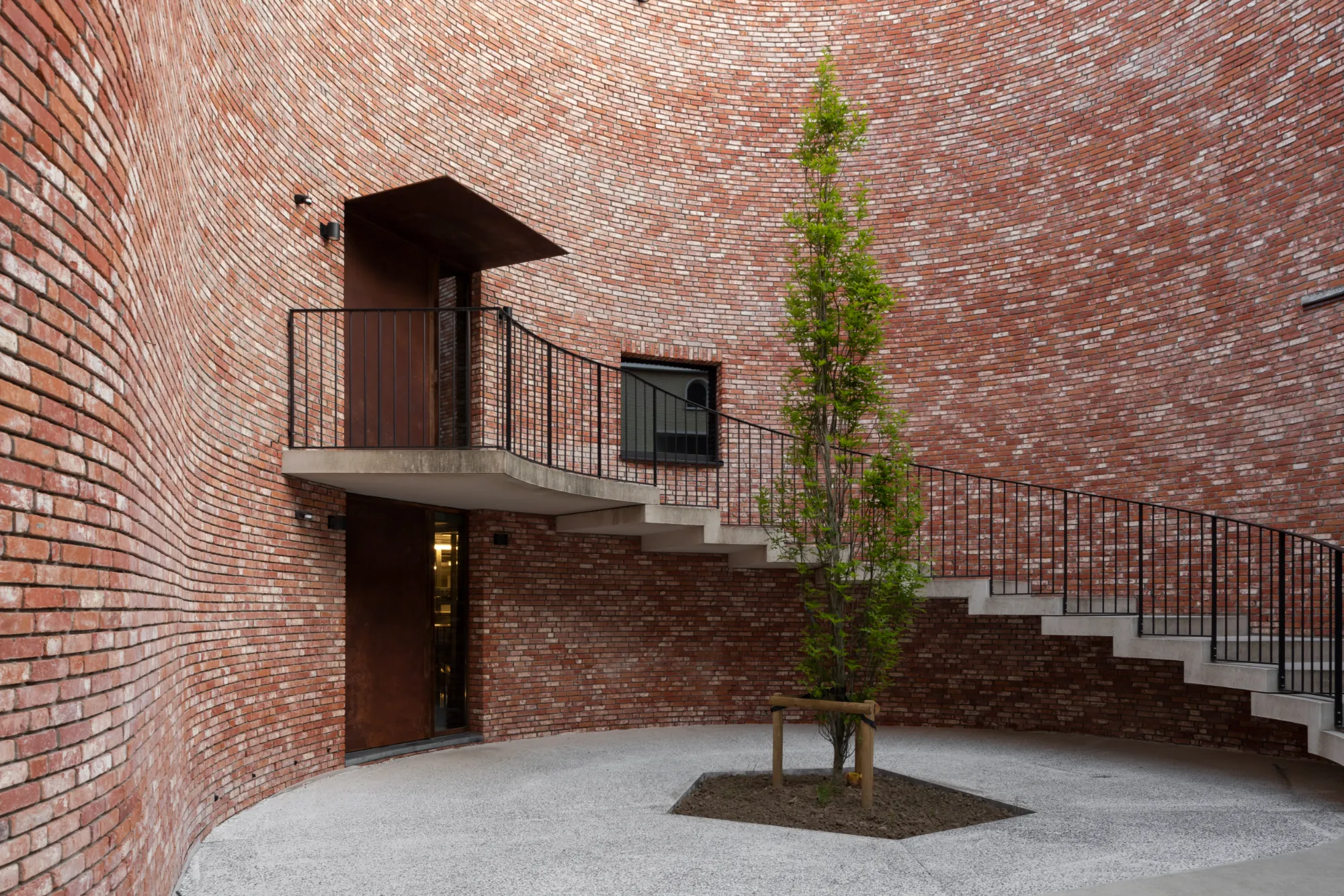 De patio vormt een ingetogen maar verfijnde toegang, waar materialiteit, groen en licht een rustige sequentie creëren voor bezoeker en brouwer. Het gebouw combineert kleinschalige dorpsarchitectuur met de verfijning en precisie die het brouwerijproces vraagt — een coherent geheel waarin traditie, functionaliteit en hedendaagse detaillering samenvloeien.