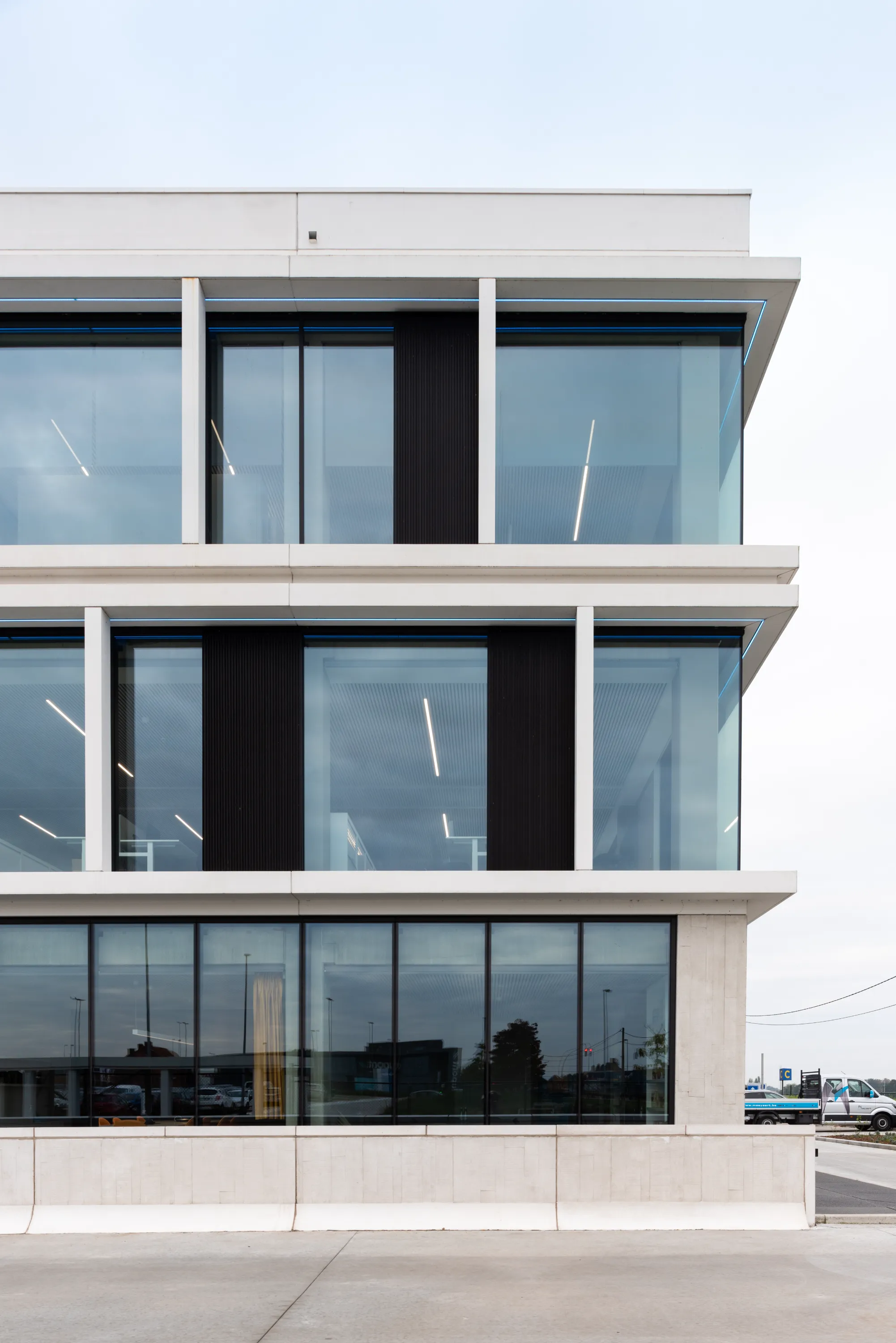 Het nieuwe kantoor wordt strategisch tegen de bestaande bedrijfshallen ingepland, waardoor de groei van het bedrijf op een compacte en efficiënte manier wordt opgevangen. Deze keuze laat toe om naast de huisvesting van circa 80 bedienden ook nieuwe sociale ruimtes voor de arbeiders te integreren. De robuuste basisstructuur in grijze betonplint en witte architectonische betonelementen verankert het gebouw stevig binnen het industriële kader.