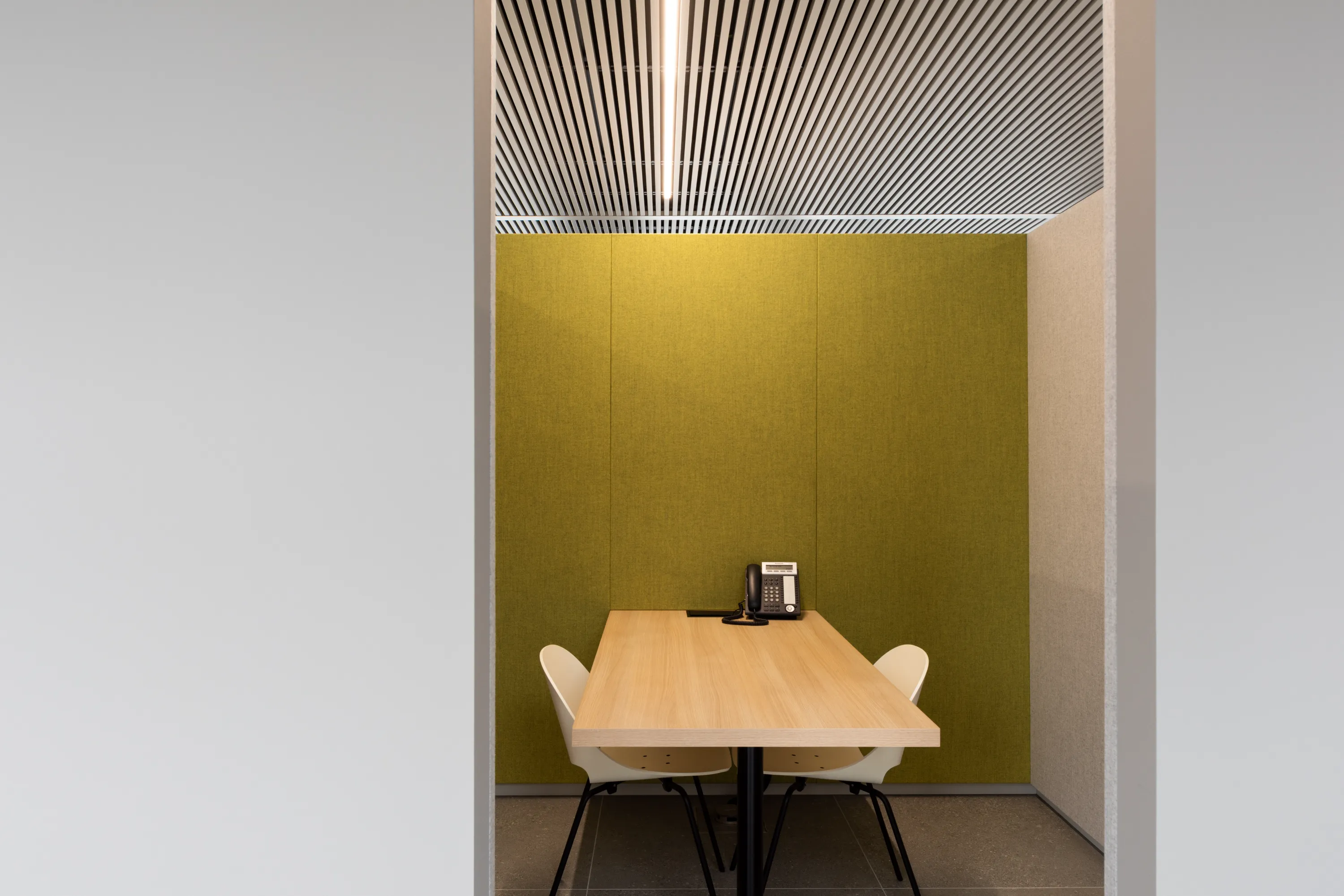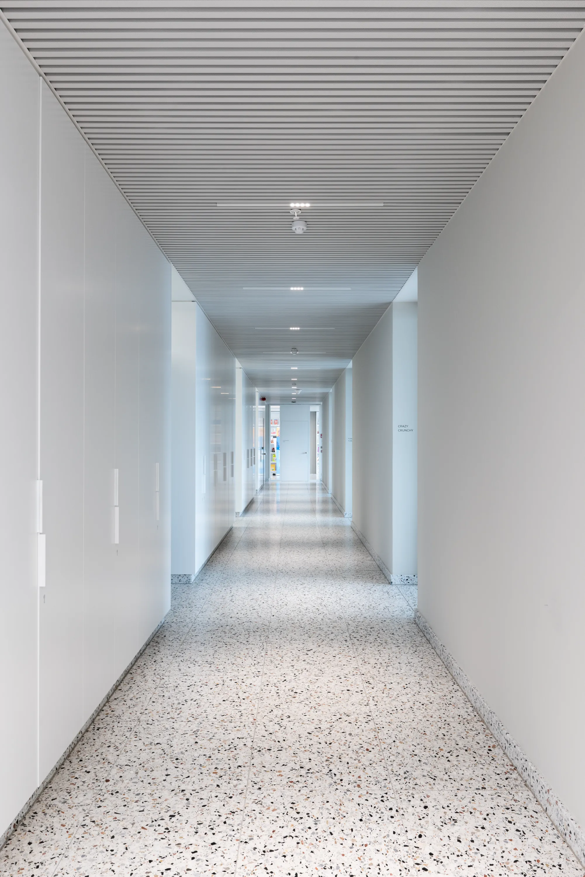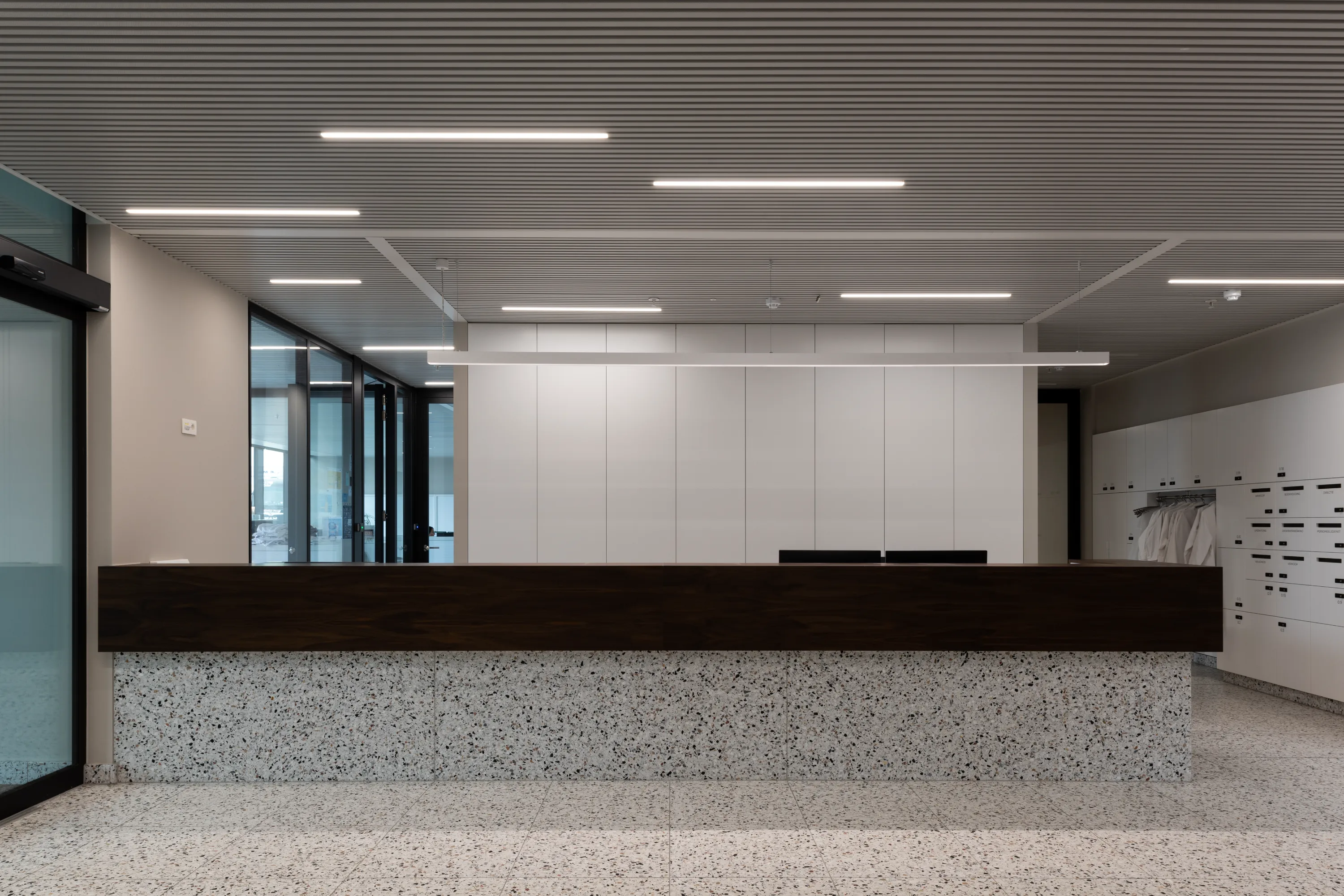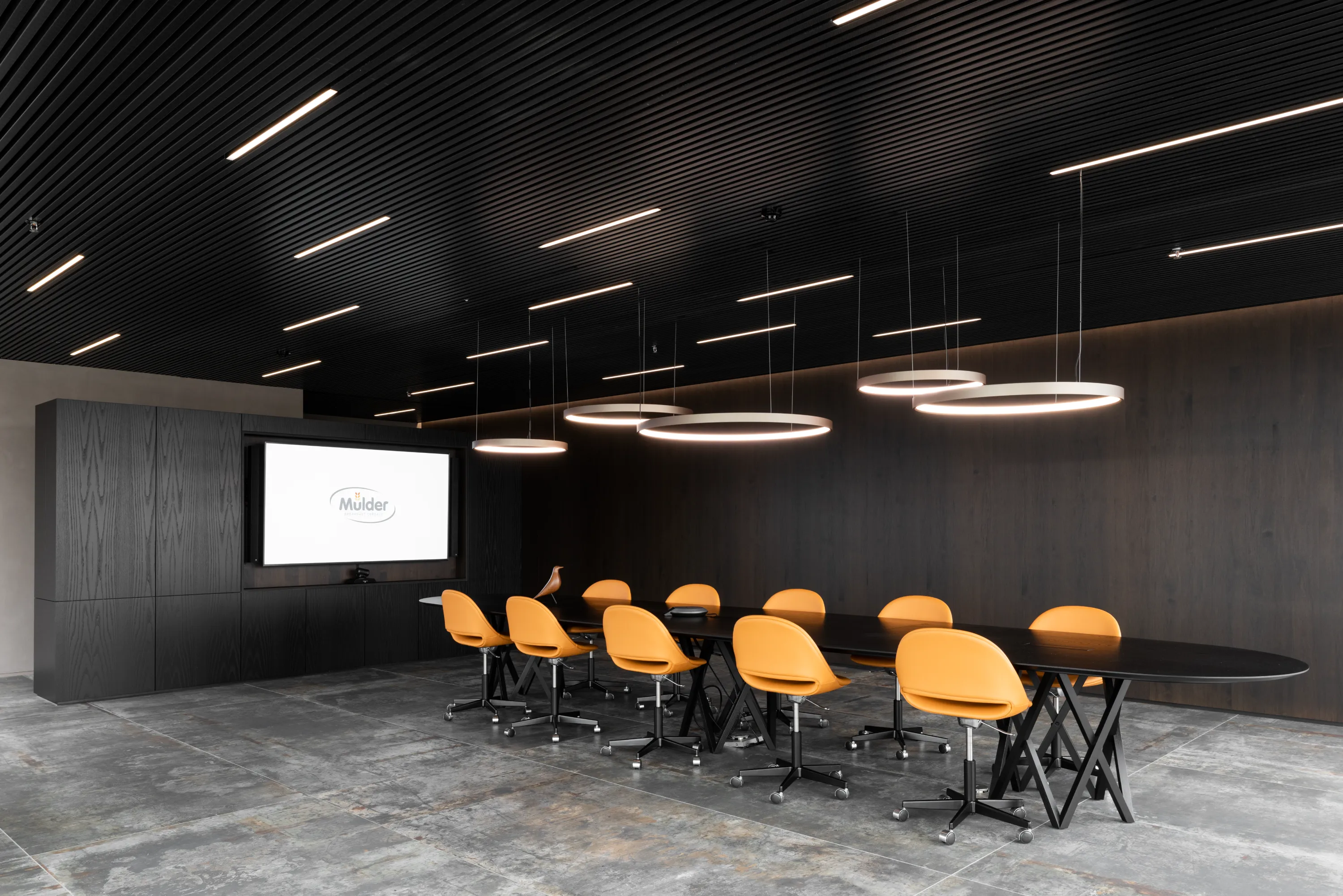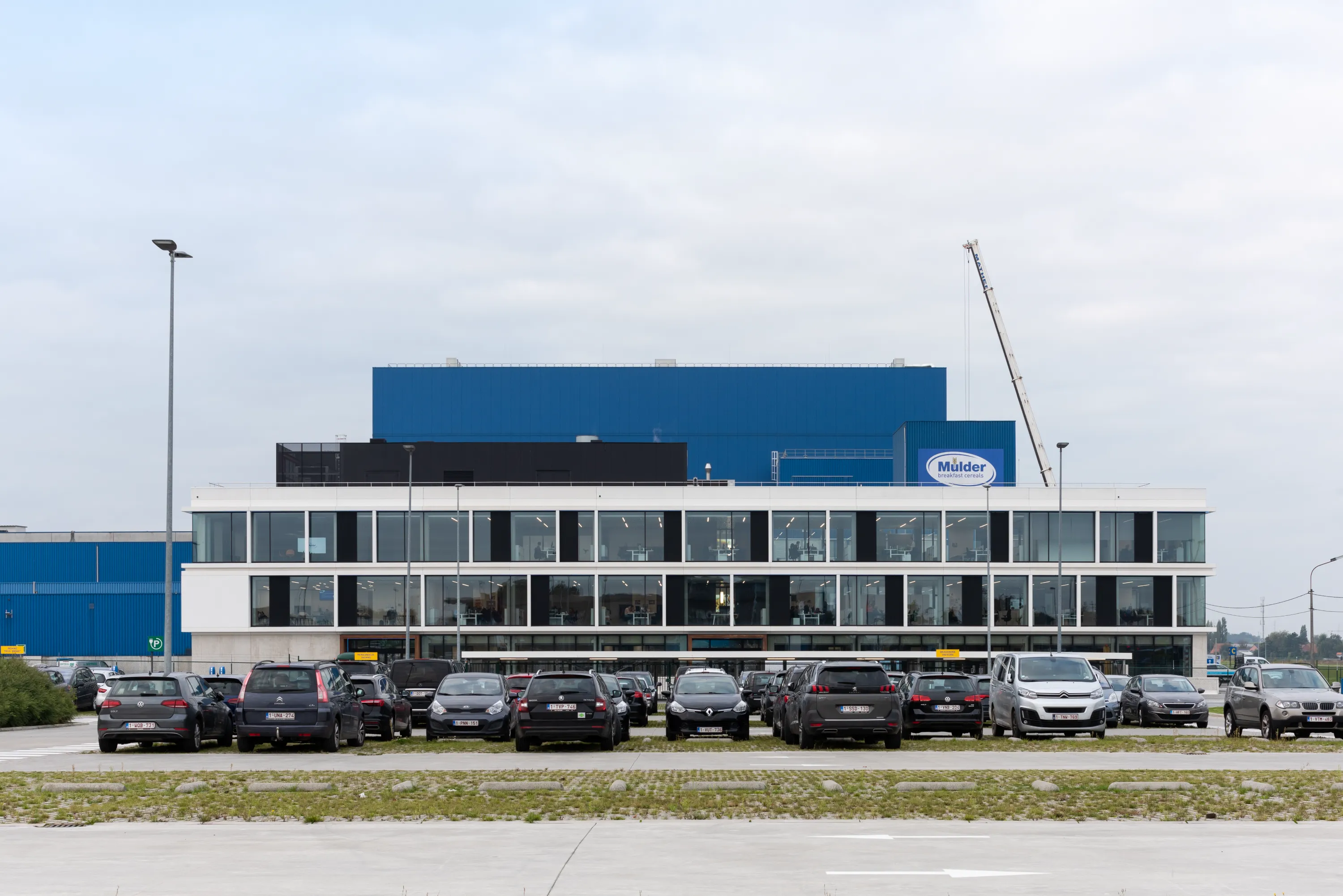 De materialisatie weerspiegelt bewust de ingetogen identiteit van Mulder Natural Foods. De combinatie van grijze plankenbekiste betonplint en witte prefabgevelelementen biedt een rustige, evenwichtige uitstraling die contrasteert met de expressieve blauwe panelen van de bedrijfshallen. De architectuur zoekt harmonie in eenvoud: een helder, verzorgd en representatief geheel dat tegelijk past binnen de bestaande site.