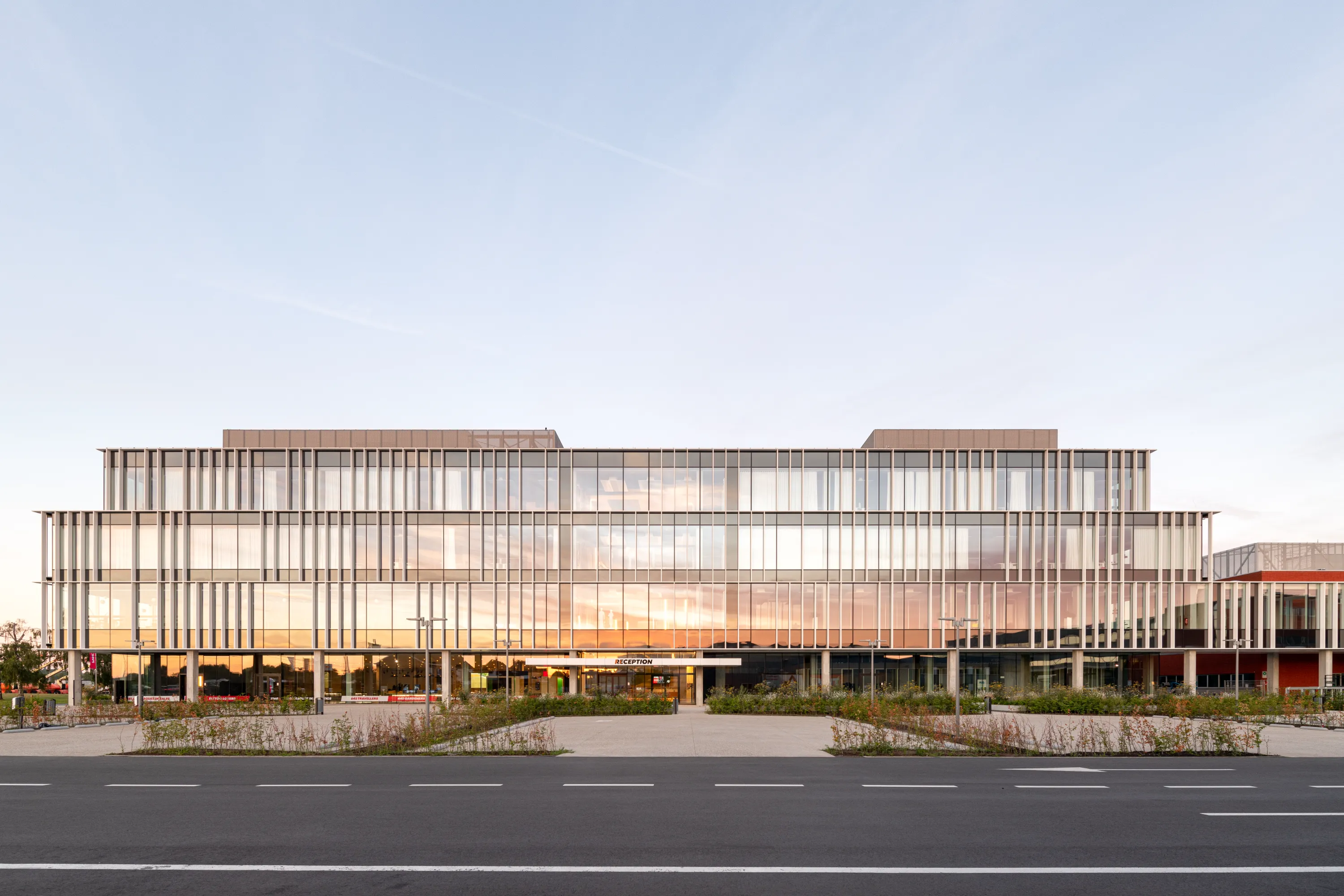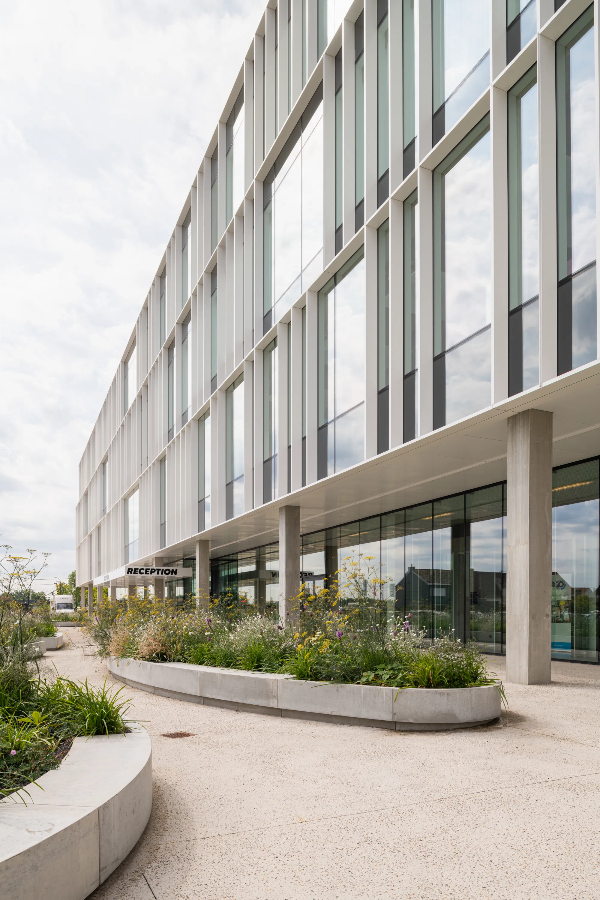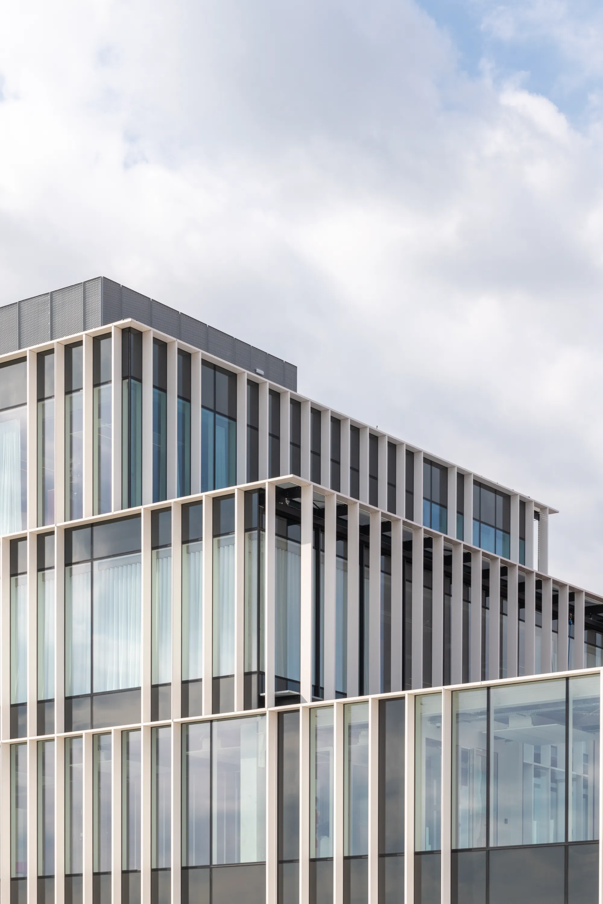 De kantoorlagen worden onderling verschoven, wat een dynamische horizontale compositie oplevert en de passerelle logisch integreert in het architecturale geheel.