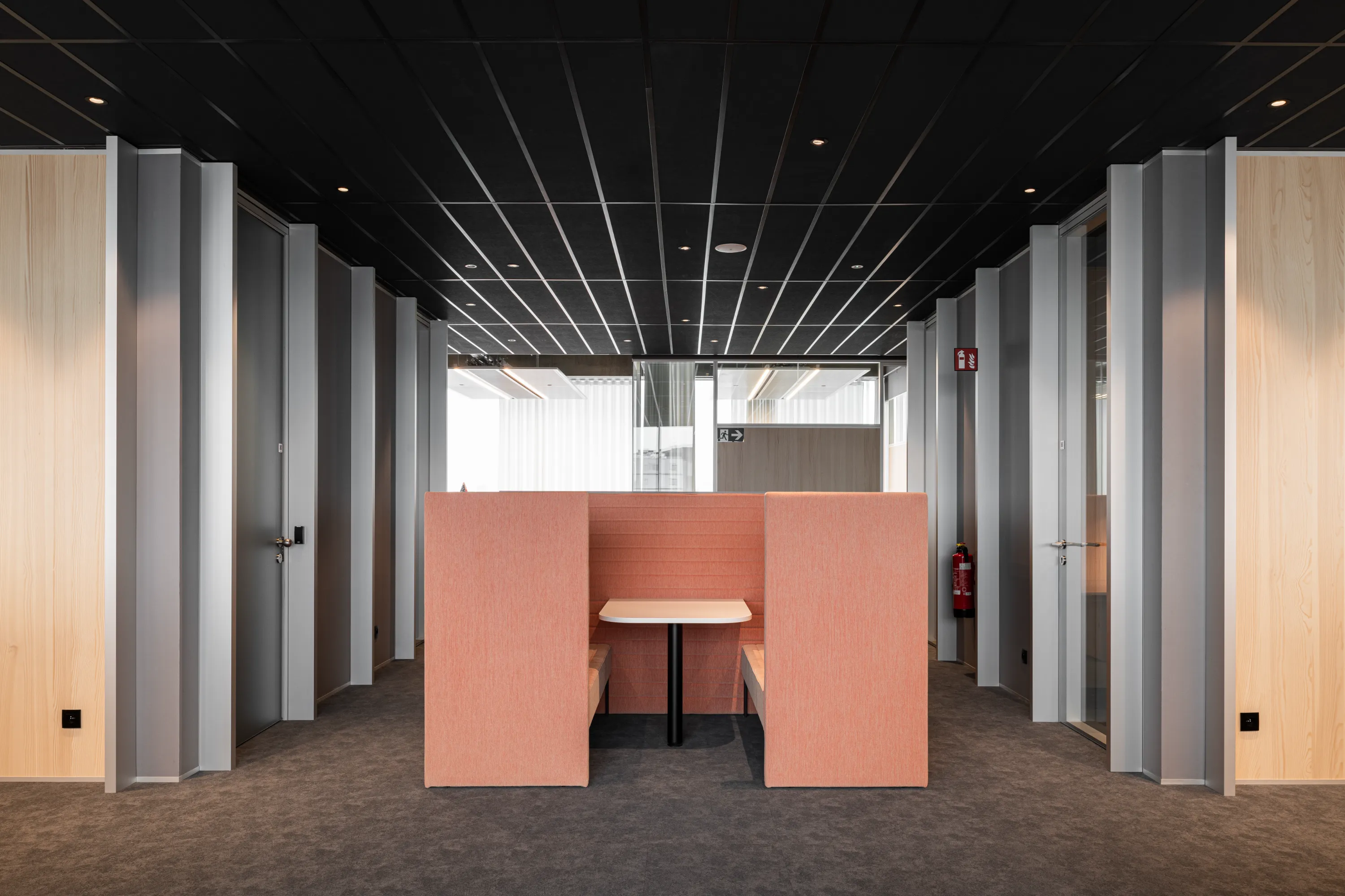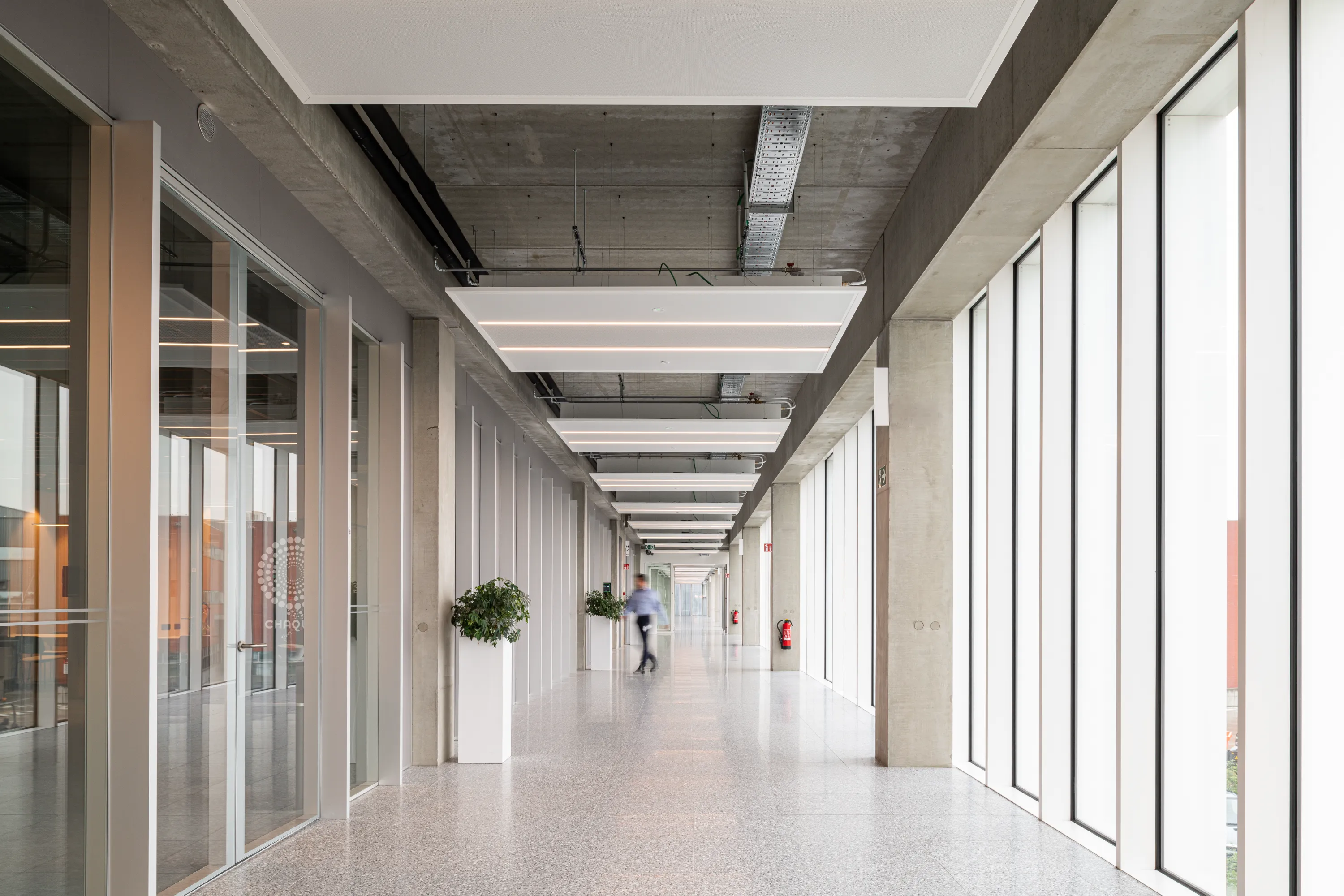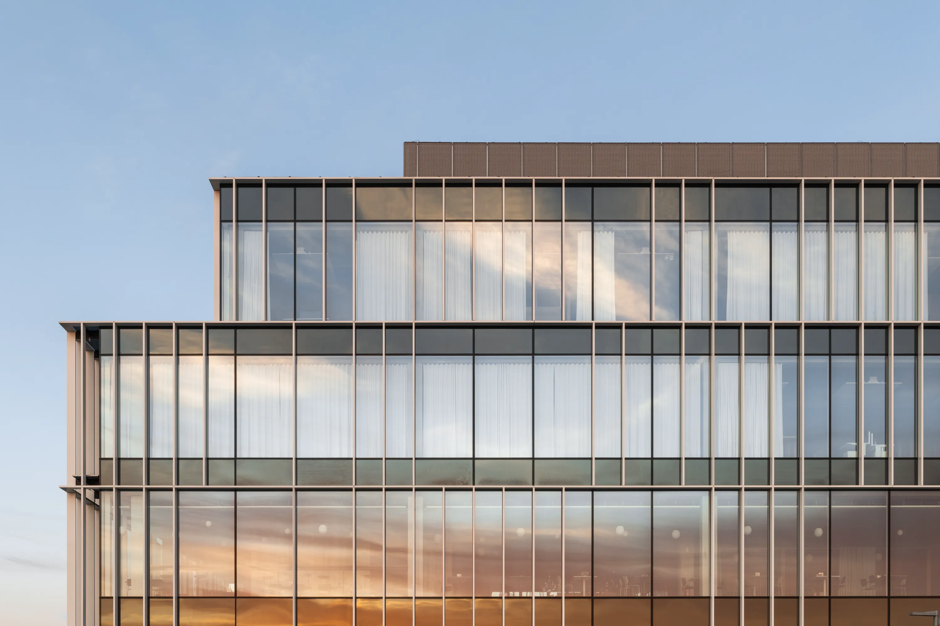 De kantoorlagen worden onderling verschoven, wat een dynamische horizontale compositie oplevert en de passerelle logisch integreert in het architecturale geheel.