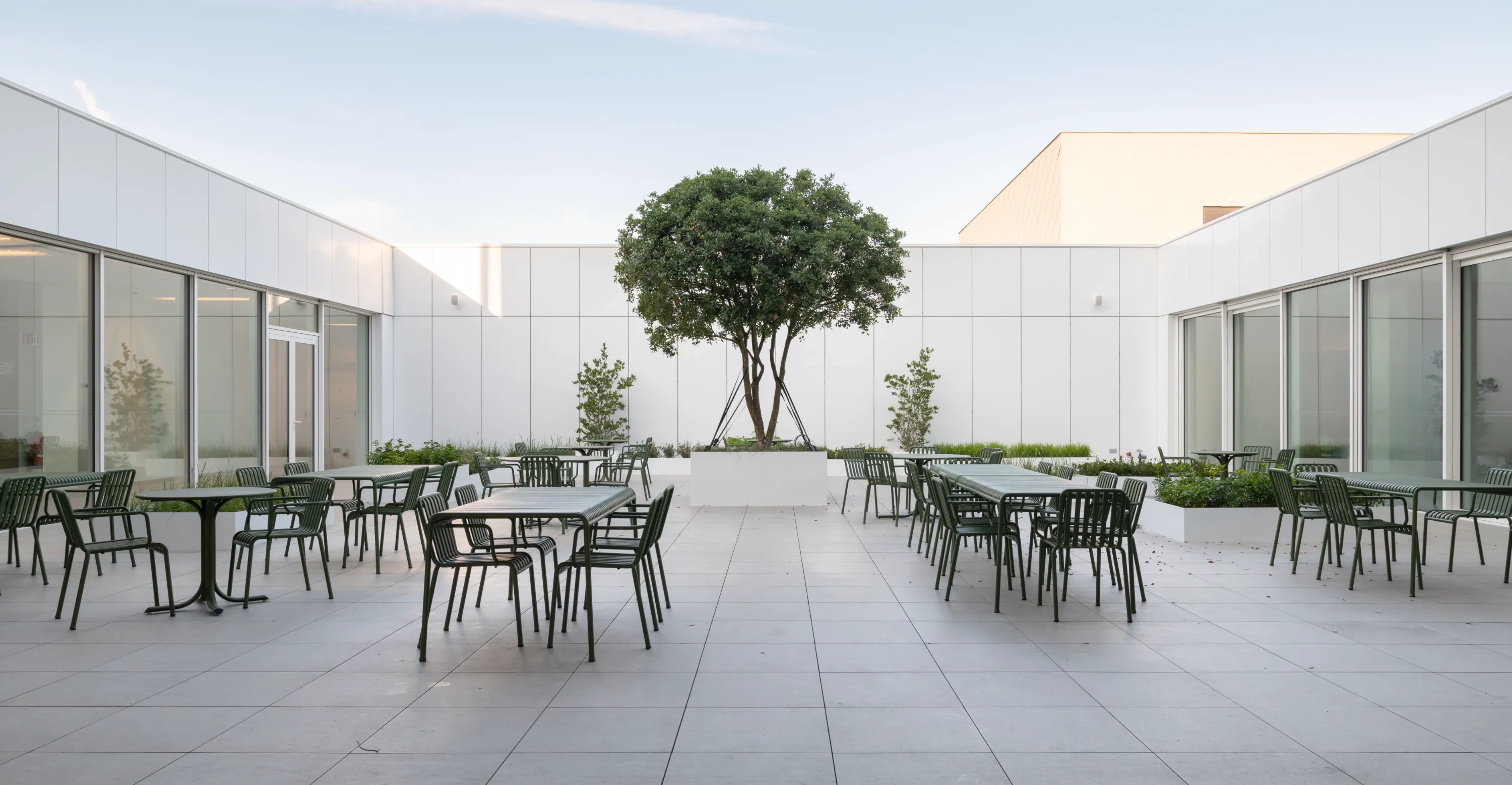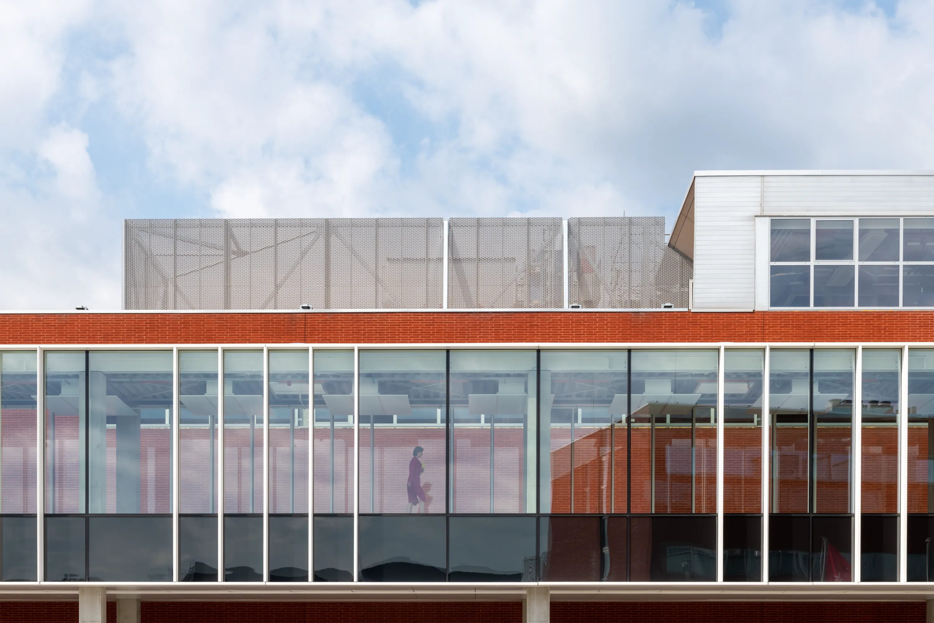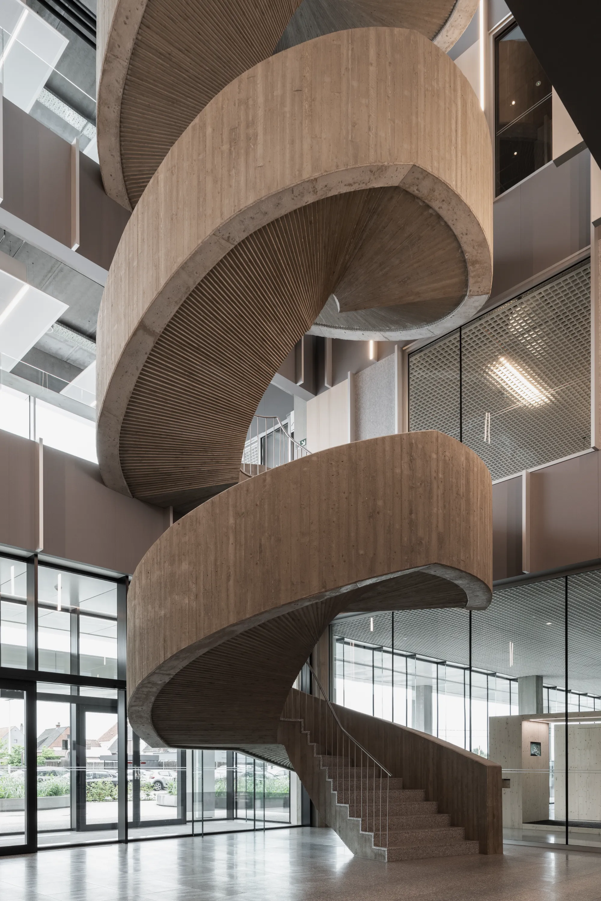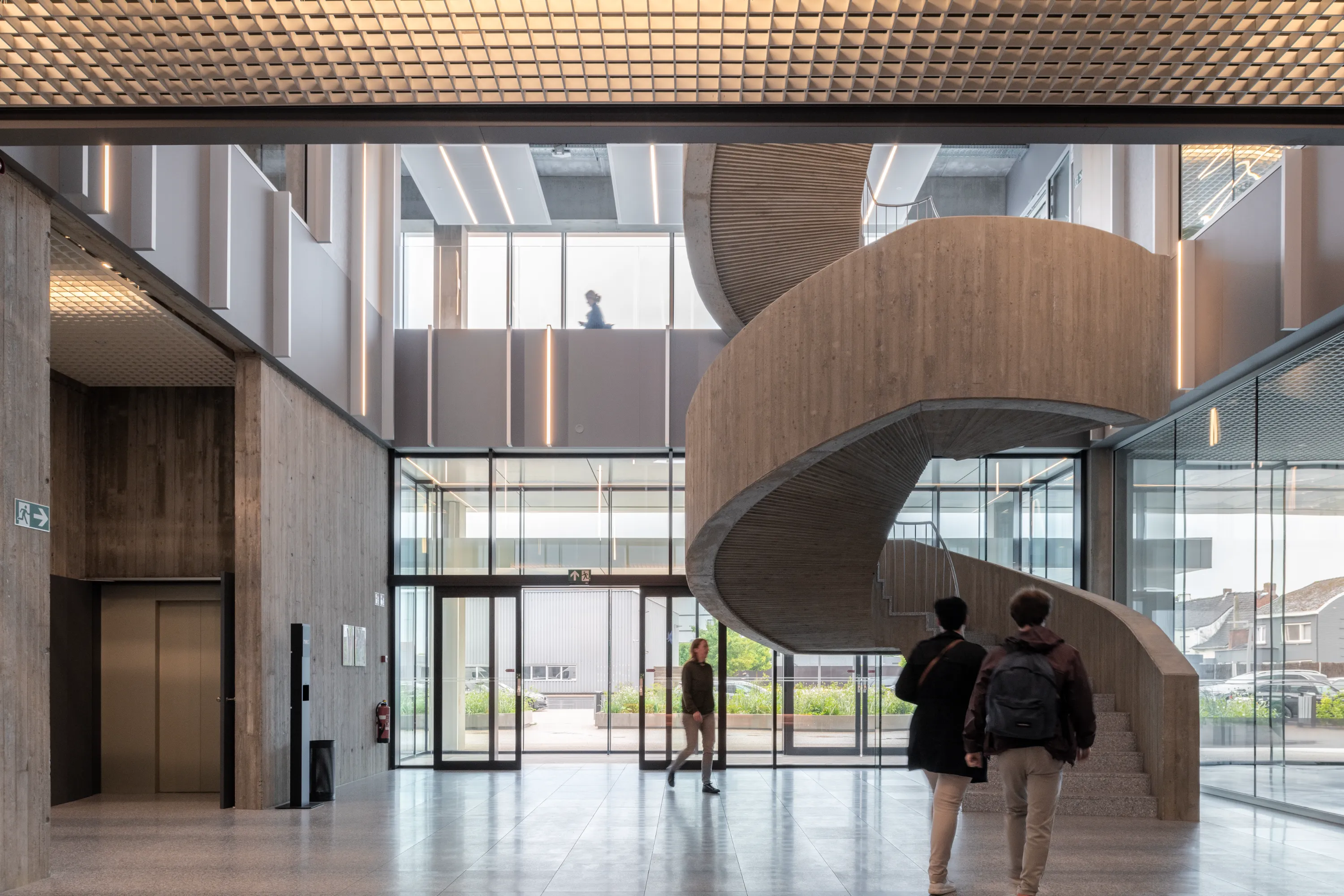 Door de verschuivingen tussen de bouwlagen ontstaat een elegante, horizontale opbouw die beweging en lichtheid toevoegt. De derde verdieping wordt bewust teruggetrokken om de lichttoetreding naar de historische conciërgewoning te behouden en de schaal aan de straatzijde te verzachten. De combinatie van transparantie, dieptewerking en verfijnde volumetrie zorgt voor een representatieve maar evenwichtige architectuur aan de entree van de TVH-campus.