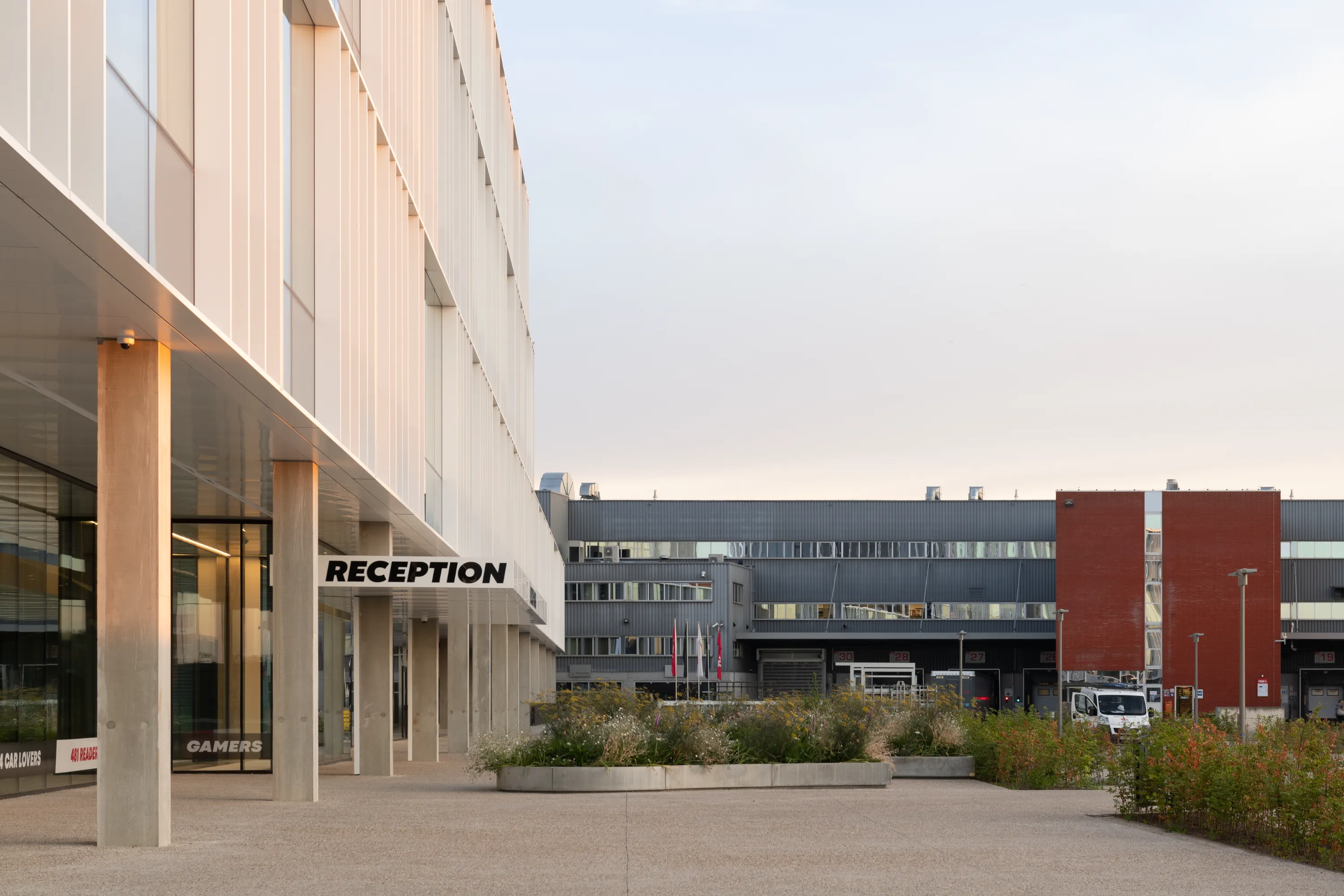Het nieuwe kantoor- en visitors center wordt ingeplant aan de hoofdtoegang van TVH, als een verlengstuk van de bestaande kantoren. Via een passerelle op niveau +1 ontstaat een continue interne route van de E17-zijde tot aan de Brabantstraat. De positionering versterkt de leesbaarheid van de site en creëert één heldere, geïntegreerde toegangspoort.